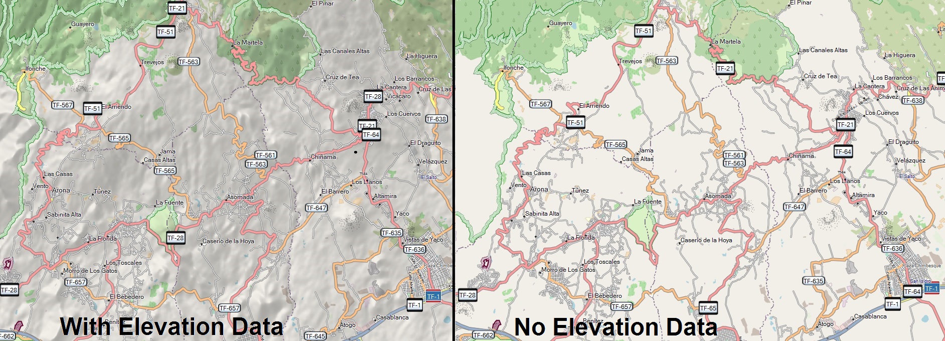 the hill-shading/elevation data - this means that they are slightly smaller in