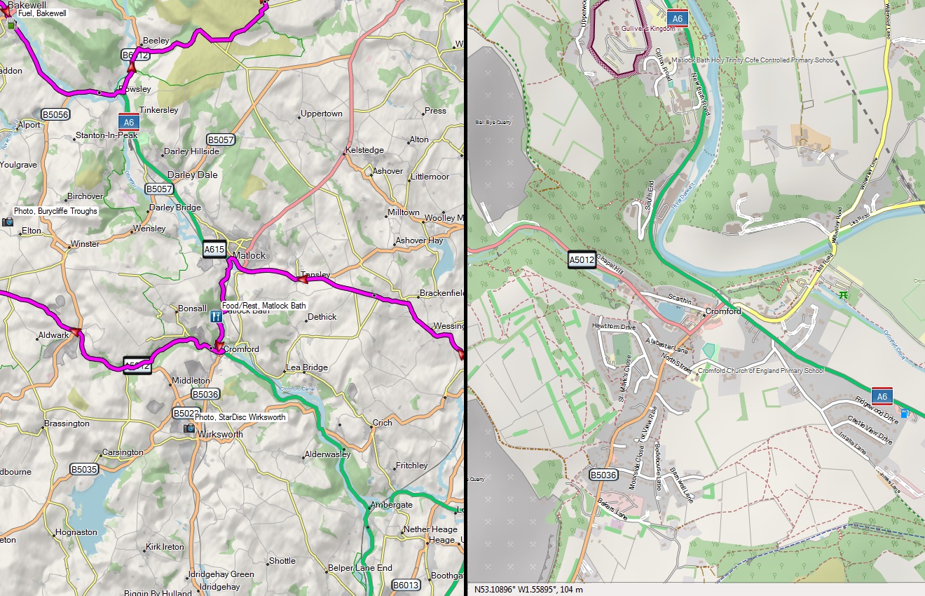 With the emphasis on clear road identification (eg: highway "shields") along with colour-recognition it makes for a much easier process of identifying road-types, planning and improves the user experience (for me, anyway!). Most POIs render at the highest zoom-level, with petrol stations appearing a little earlier. Fuel stations can be searched for as can any Address/POI.