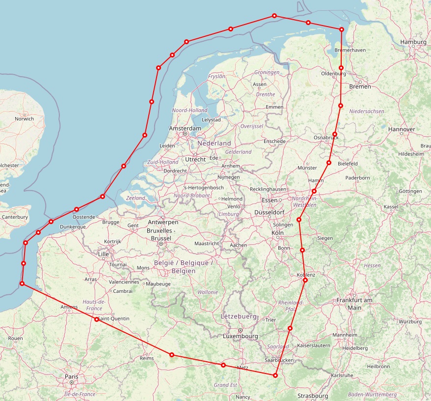 For instance, if you're doing a tour around Belgium and Calais is your arrival/departure port - you'll probably want an area like this. This gives you a good amount of surrounding area without having to use individual Country maps.